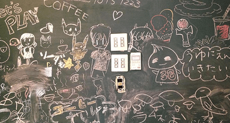 落書きから伝言まで、悪口以外はなんでもオーケーな黒板です。もちろん、38℃カフェの宣伝を書いてくれてもかまいません。